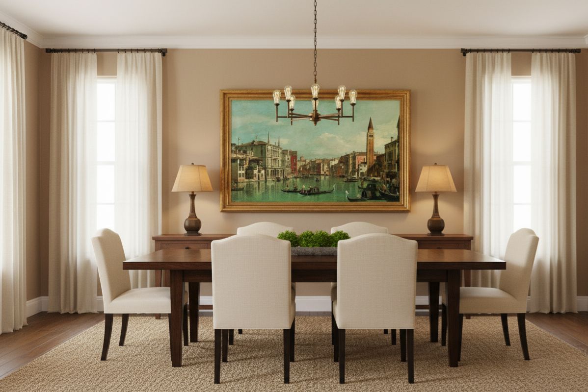 Canaletto’s work appealed especially to British collectors on the Grand Tour, leading to a strong international reputation. His paintings, often featuring the Grand Canal, Piazza San Marco, and various Venetian landmarks, combined architectural accuracy with soft skies, shimmering water, and the gentle bustle of daily life. He also spent a significant period working in England (1746–1755), where he painted London views and English country estates. Canaletto’s legacy is marked by his ability to blend technical mastery, realism, and poetic charm, securing his place as one of the greatest cityscape artists in Western art history.